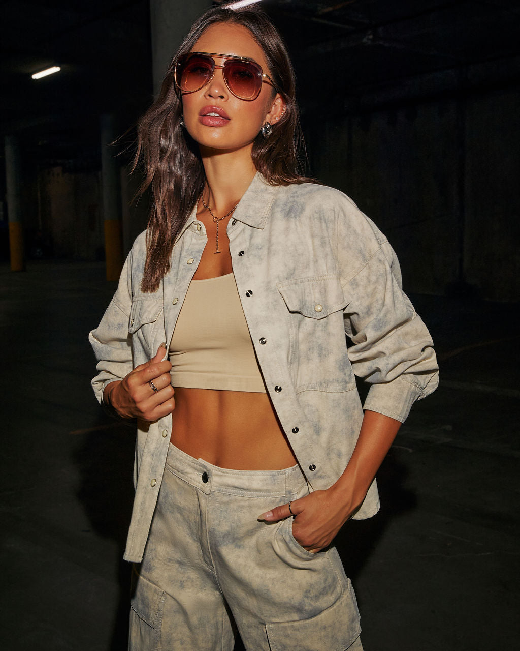 Perfect for a standout evening. the Front Line Button Down Top is where edgy cool meets effortless sophistication. Crafted from lightweight twill fabric. this top features sleek breast flap pockets with snap button closures and a front snap button closure for a chic. streamlined finish. As part of a matching set with the Front Line Cargo Pants (sold separately). it effortlessly blends rebellious fashion with feminine charm.